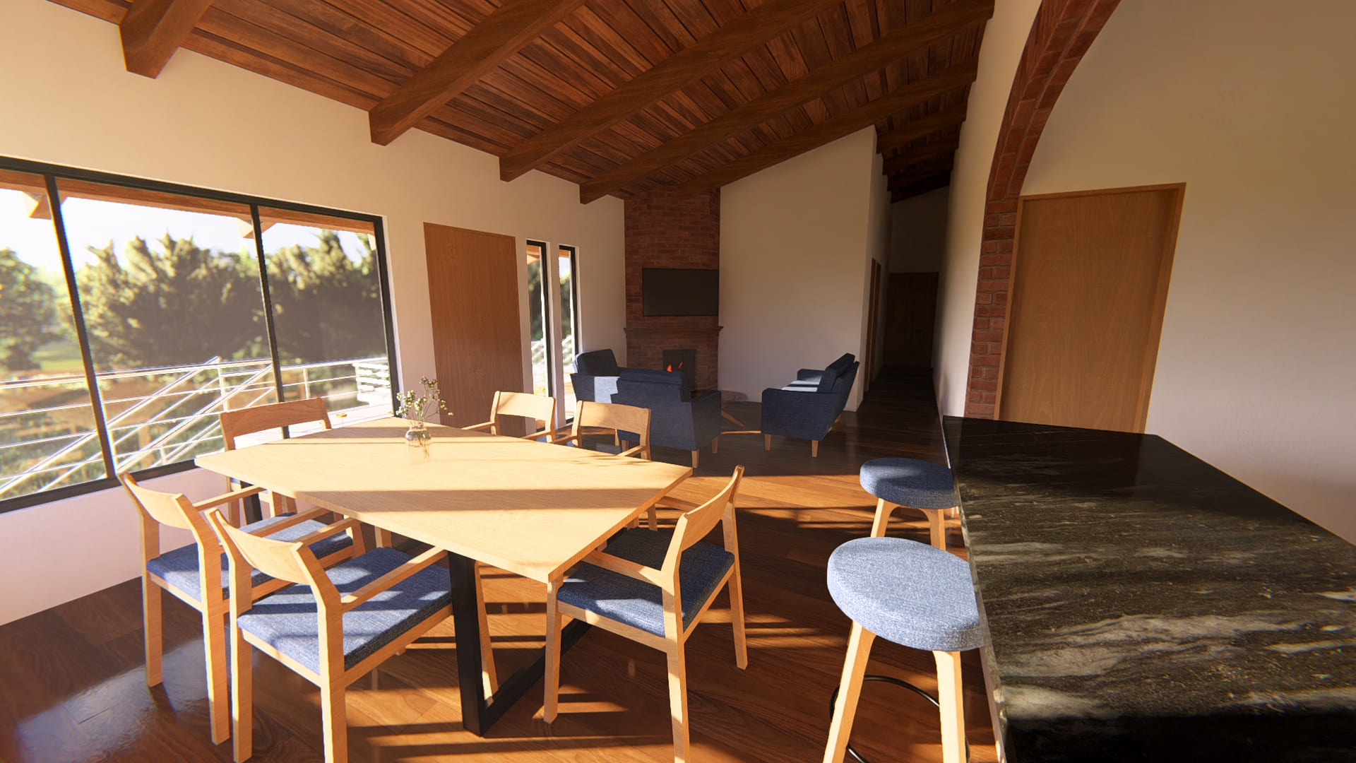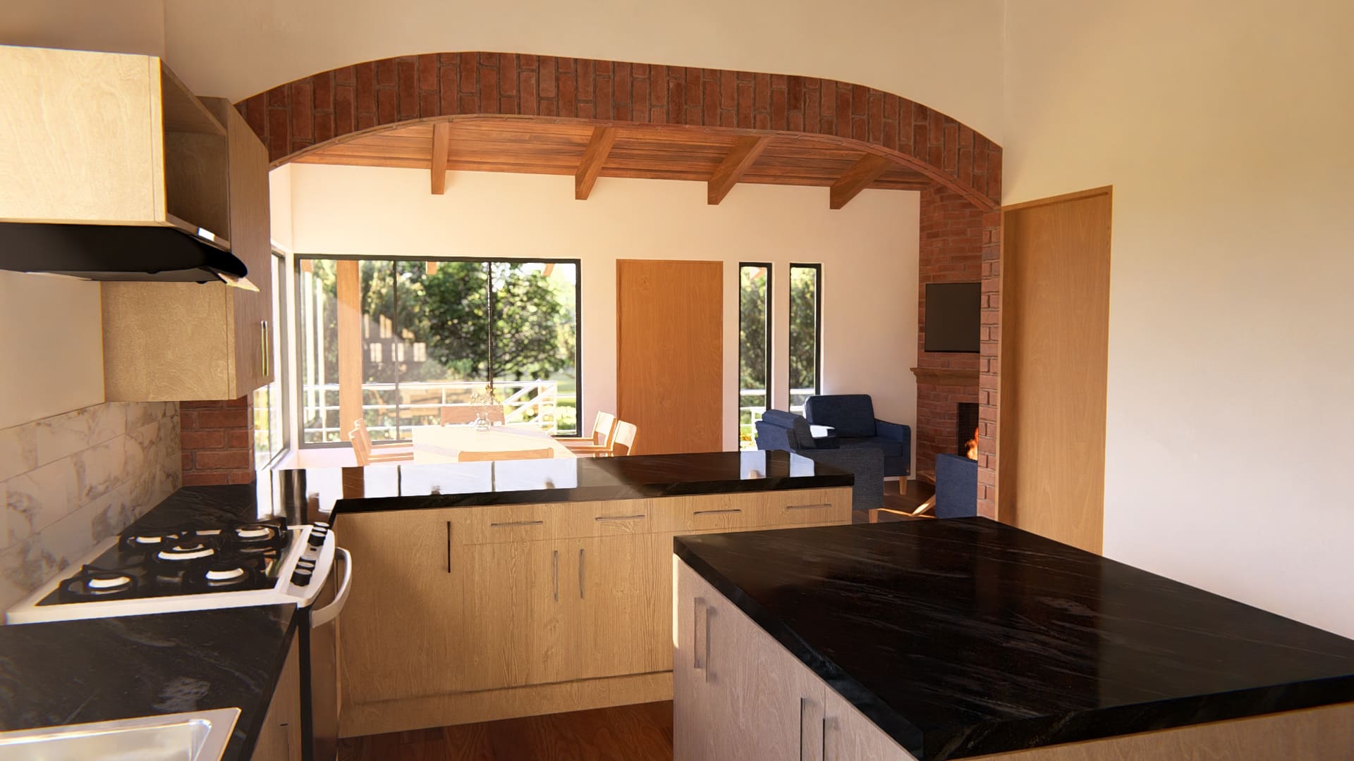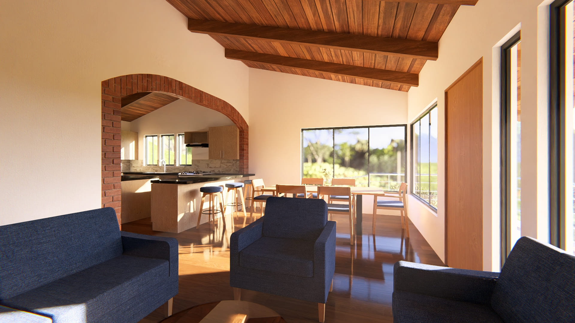Rodeada de naturaleza, esta vivienda que se encuentra en ejecución actualmente, busca crear espacios cómodos y visualmente atractivos. Rodeada de ventanas y vidrieras, cada espacio se llena de luz natural durante todo el día, haciendo que los ambientes se mezclen con la naturaleza que los envuelve.