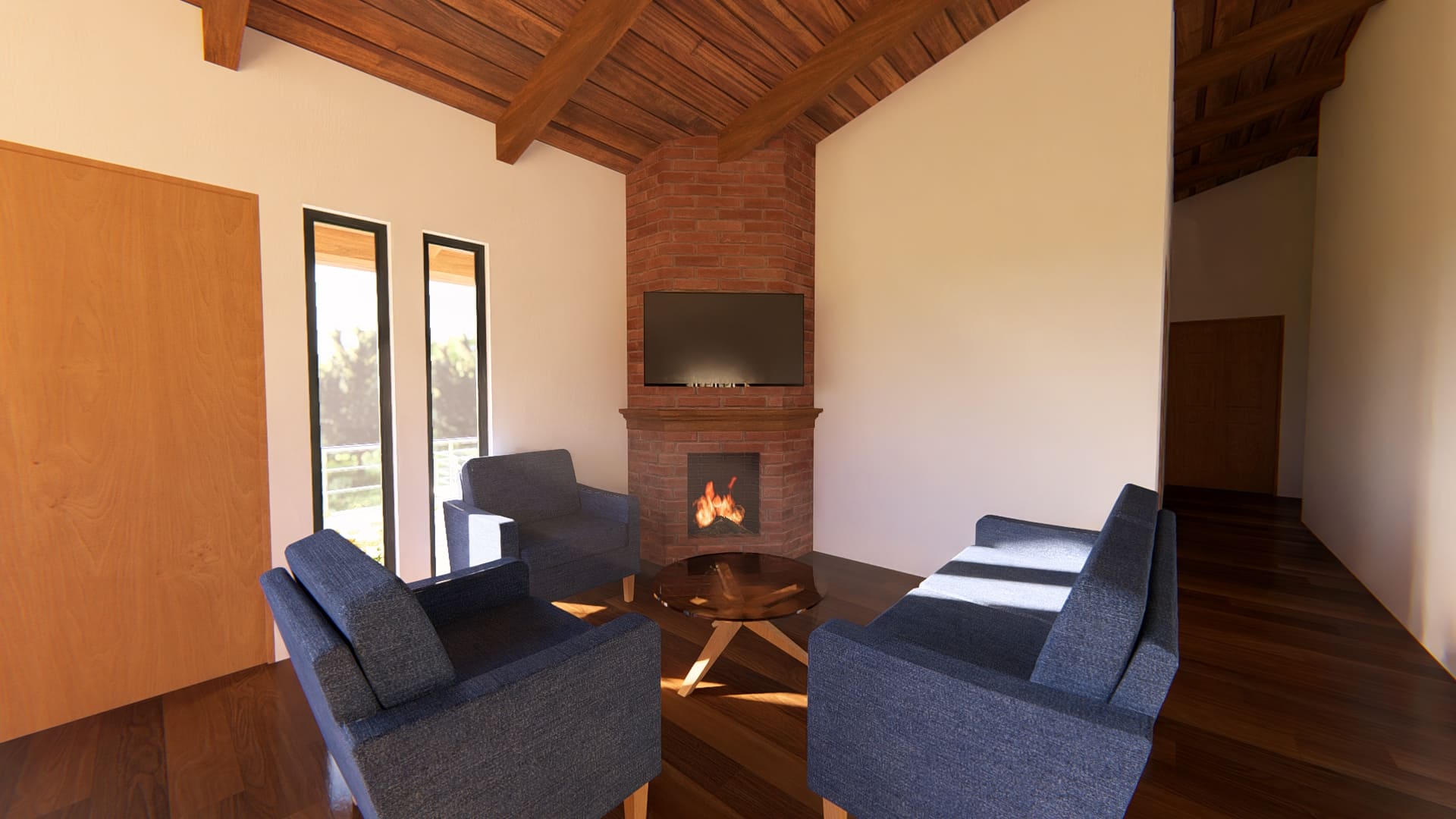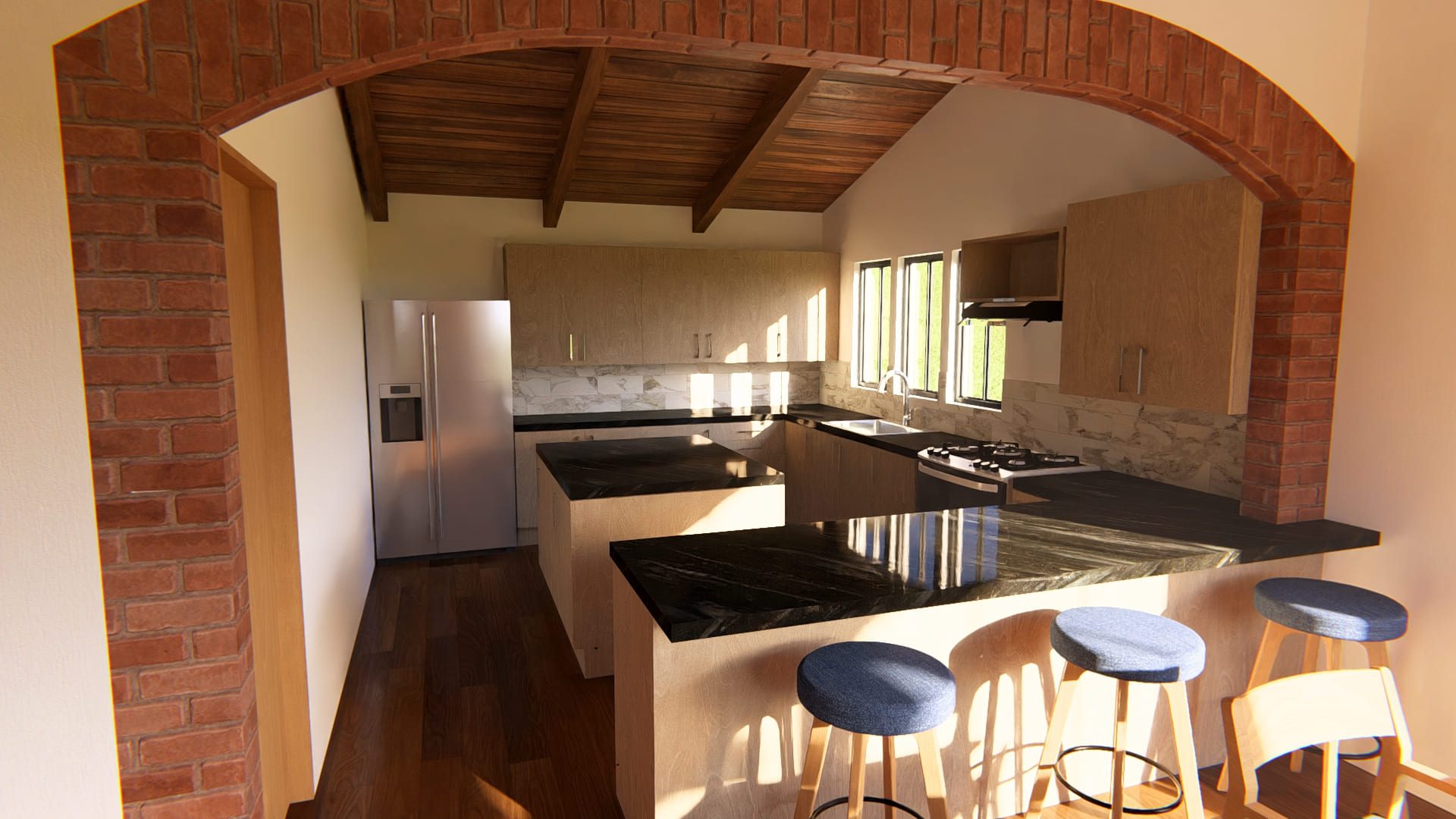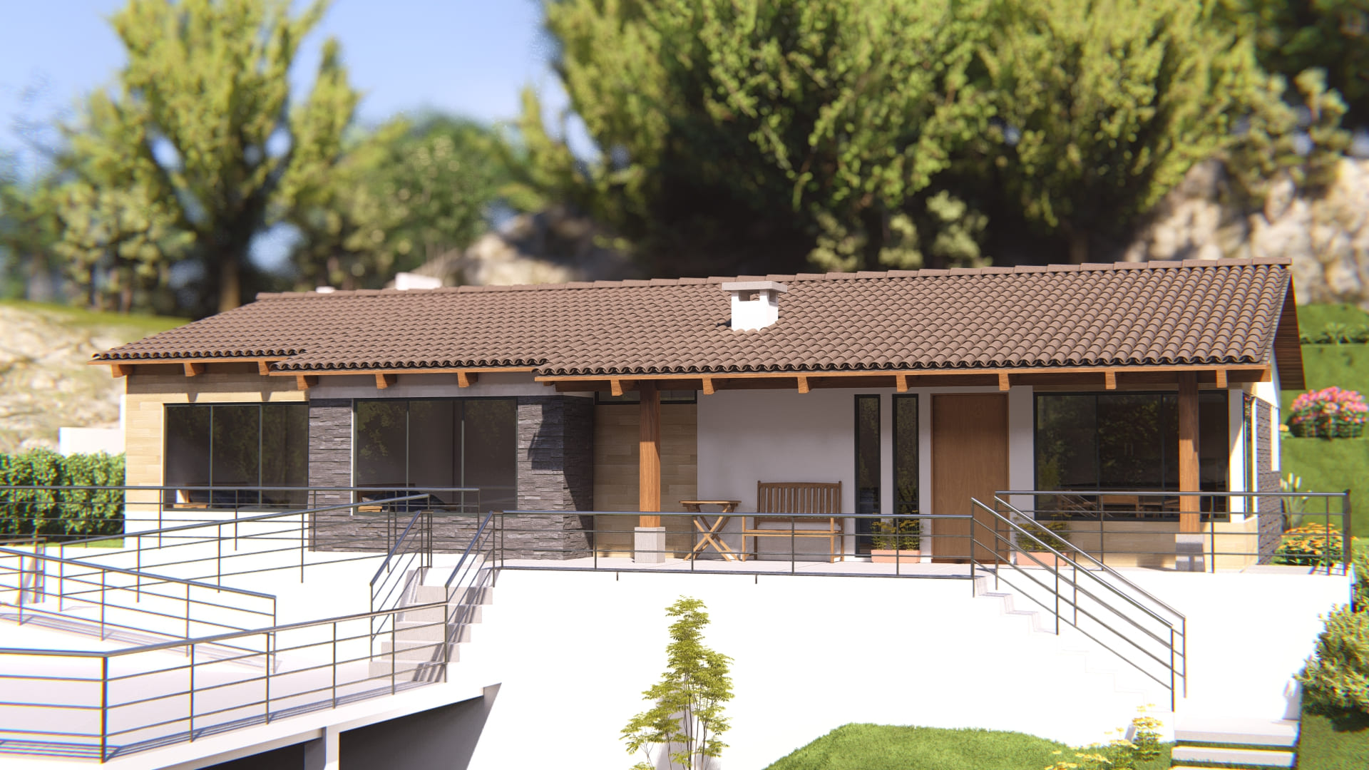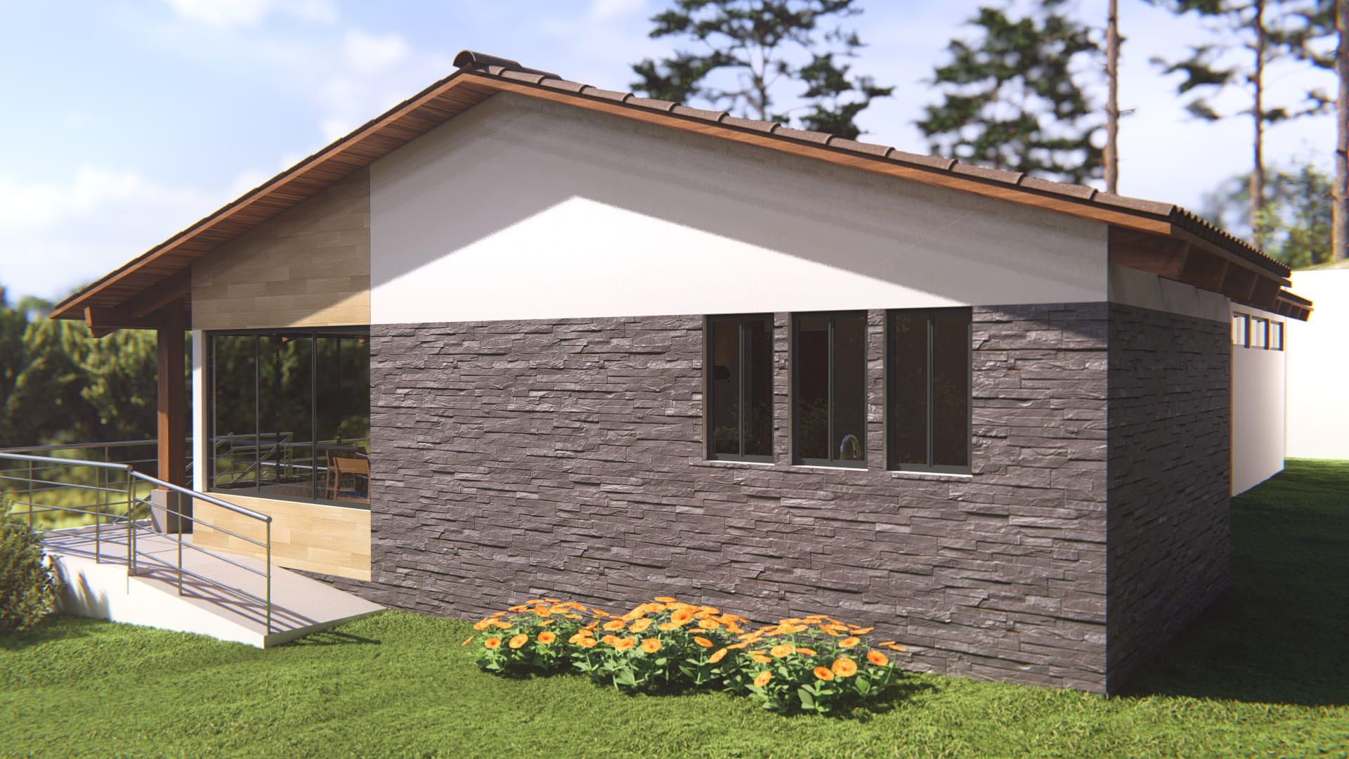 Rodeada de naturaleza, esta vivienda que se encuentra en ejecución actualmente, busca crear espacios cómodos y visualmente atractivos. Rodeada de ventanas y vidrieras, cada espacio se llena de luz natural durante todo el día, haciendo que los ambientes se mezclen con la naturaleza que los envuelve.
